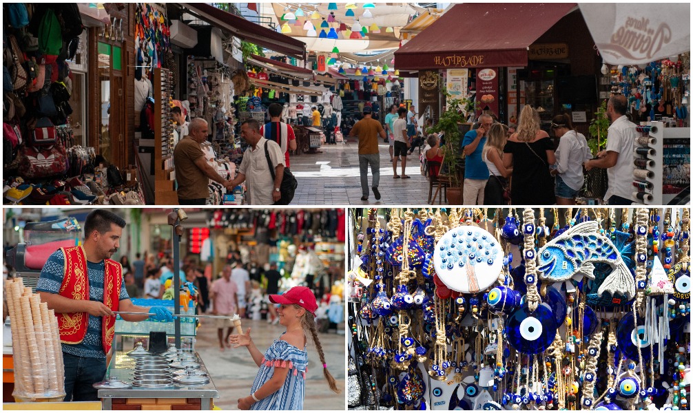 Das Einkaufen ist in den kleinen Gassen von Bodrum ein Vergnügen. Natürlich gibt es ein übergroßes Angebot an türkischem Handwerk, Gegenständen aus Kupfer und Bronze, aus Silber und Gold sowie Kunsthandwerk und Stickereien. Die beliebtesten Einkaufsobjekte sind Teppiche, aber beim Kauf von Teppichen sollte man sich vorher unbedingt genau informieren und ausgiebig feilschen.