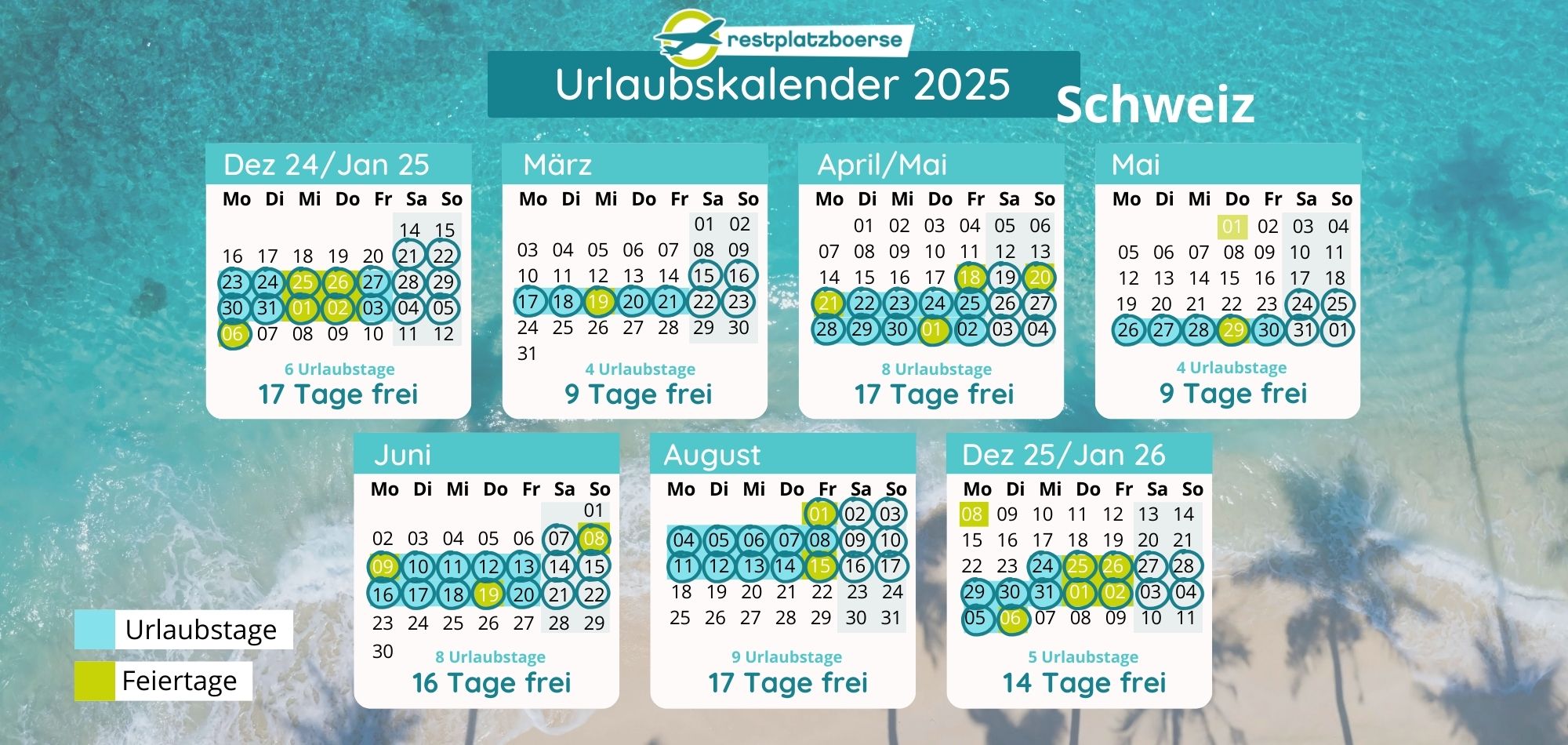 2025 wird Erholung großgeschrieben, denn die Feiertage fallen besonders gut. Wenn Sie Ihre freien Tage clever planen, können Sie die Ferienzeit verdoppeln! In der Kalenderübersicht sind alle Brückentage 2025 auf einen Blick sichtbar. So viele Brücken- und Feiertage im Jahr schreien nach den passenden Angeboten! Die besten Deals der Restplatzbörse für die Feiertage 2025 finden Sie weiter unten.