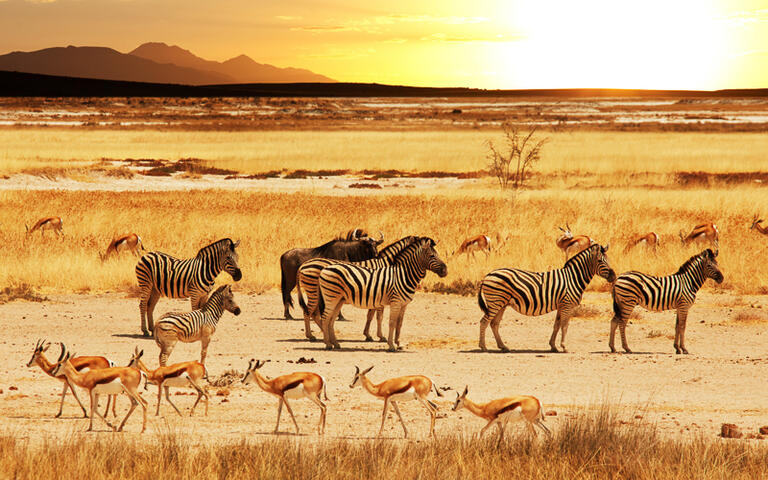Namibia besticht durch seine mannigfaltige Tierwelt, die in zahllosen Tierschutzgebieten vorbildlich gehegt wird. In größeren und kleineren Naturschutzgebieten sowie privaten Tierparks sind Tiere geschützt und in freier Wildbahn zu erleben. Das gilt auch für die sogenannten Big Five, also Löwen, Elefanten, Nashörner, Büffel und Leoparden. Am bekanntesten ist der im Norden von Namibia gelegene Etosha National Park. Er beeindruckt bereits durch seine Größe, die in etwa den Ausmaßen der Schweiz entspricht. Zudem ist er die Heimat von bis zu 140 Säugetierarten und über 300 Vogelarten. Bei den geführten Touren kann man Giraffen und Oryxantilopen beim Weiden beobachten. Beeindruckend ist auch der Anblick von Geparden, Leoparden oder Löwen, die immer wieder im hohen Gras oder unter Schatten spendenden Büschen bei ihrer Siesta entdeckt werden können. Große Herden von Elefanten suhlen sich in den Wasserlöchern und verschiedene Nashornarten ziehen unaufgeregt durch die unendlichen weiten der Savannenlandschaft. Im Sumpfgebiet des Caprivizipfels sind Wasserbüffel, Alligatoren und Nilpferde zu Hause.