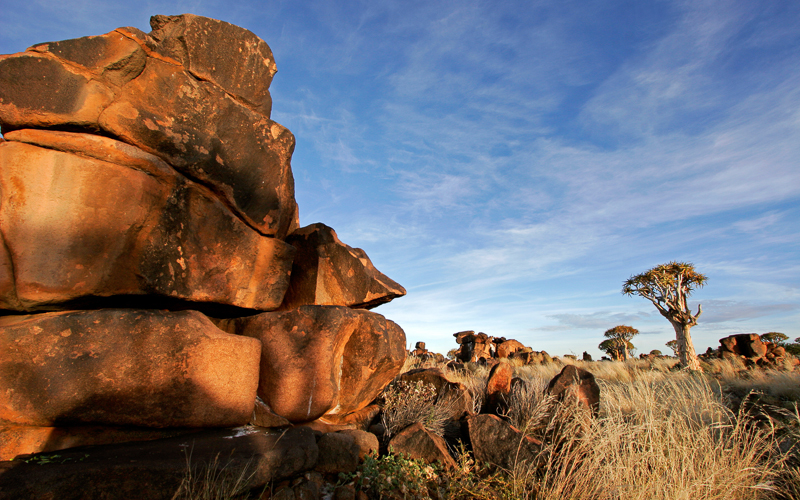 Überall in Namibia sind imposante Naturlandschaften zu finden. So zählt das Tal Twyfelfontein mit seinen über 2.500 Felsgravuren auf über 200 Felsplatten seit 2007 zum Weltnaturerbe der UNESCO. In Sossusvlei im Namib Naukluft Park sind die größten Sanddünen der Welt von teilweise bis zu 300 Meter Höhe zu erleben. Im Süden des Landes bahnt sich der Fish River seinen Weg. Er fließt durch den gleichnamigen zweitgrößten Canyon der Welt. Vom Rand der Schlucht aus hat man einen atemberaubenden Blick über unberührte Fels- und Naturlandschaften. Nahe Keetmanshoop beeindruckt ein nur hier anzutreffender sogenannter Köcherbaumwald. Ebenso nur in Namibia zu Hause ist die seltene Welwetschiapflanze, deren einziges Blattpaar mehrere hundert Jahre alt werden kann. Beeindruckend ist auch die Kargheit der Skeletonküste. Ihren Namen verdankt sie einigen Schiffswracks sowie den knöchernen Überresten gestrandeter Wale. Die Natur formte im Laufe der Jahrmillionen grandiose Erscheinungen. Bei dem heutigen Ruinenort Kolmannskuppe konnte man vor hundert Jahren Diamanten bei den Bahngleisen vom Wüstenboden aufsammeln. In Swakopmund, das von Kolonialarchitektur geprägt ist, sind in einem Mineralienmuseum Stücke aus den berühmtesten Fundstellen des Landes ausgestellt, darunter etwa die Minenstadt Tsumeb oder das Brandbergmassiv. Beeindruckend ist der weltgrößte gefundene Bergkristall.