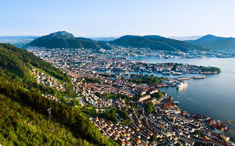 Bergen, die zweitgrößte Stadt des Landes in der Provinz Hordaland, im Westen Norwegens, besitzt einen der geschäftigsten Seehäfen Europas. Von hier aus starten auch die Schiffe der Hurtigruten. Das ist eine norwegische Postschifflinie, welche die zahlreichen Orte der norwegischen Westküste miteinander verbindet. Vom Stadtzentrum Bergens führt die Drahtseilbahn Fløibanen auf den Gipfel des Berges Fløien. Von der Aussichtsplattform bietet sich ein wunderbarer Ausblick auf die Stadt und das Umland. Bergen hat sich nach wie vor den Charme und die Atmosphäre einer Kleinstadt bewahrt. Die ältesten Gebäude wurden während der Hansezeit entlang der alten Kaimauern, der sogenannten Bryggen errichtet. Sie gehören heute zum UNESCO-Weltkulturerbe und sind Norwegens bekannteste mittelalterliche Bauwerke.